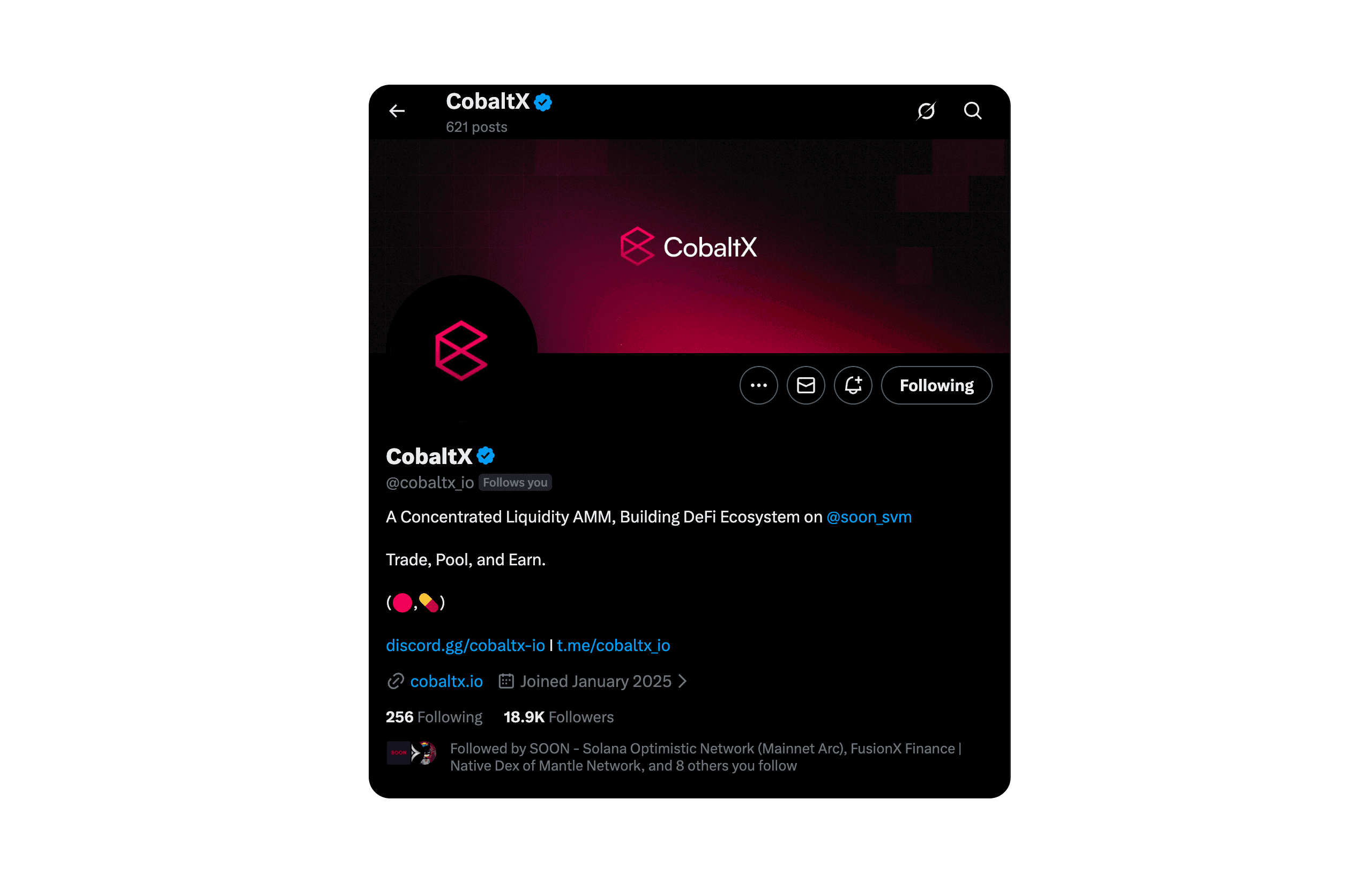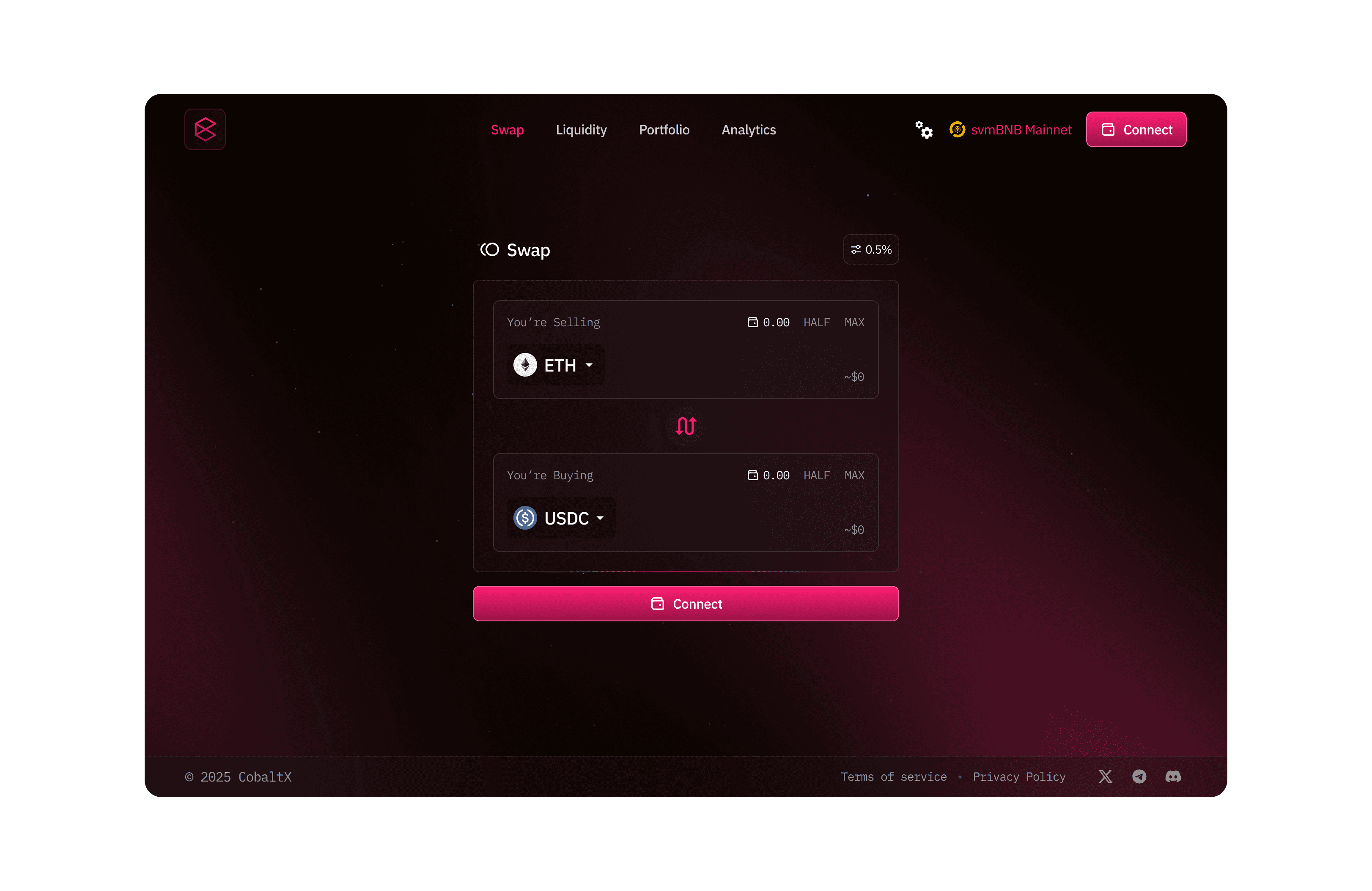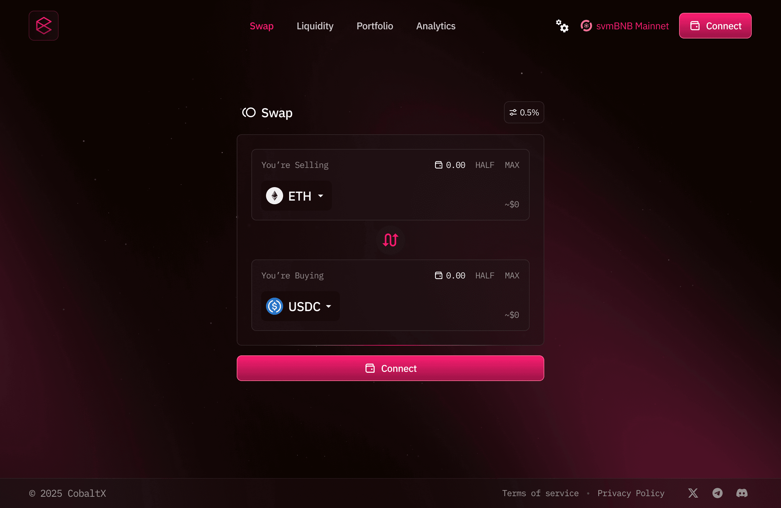 CobaltX is the native decentralized exchange (DEX) on the SOON Network, designed for ultra-fast and low-cost on-chain trading. Powered by a hybrid AMM and concentrated liquidity model, CobaltX enables seamless token swaps, permissionless liquidity pools, and efficient price discovery across the SOON ecosystem.