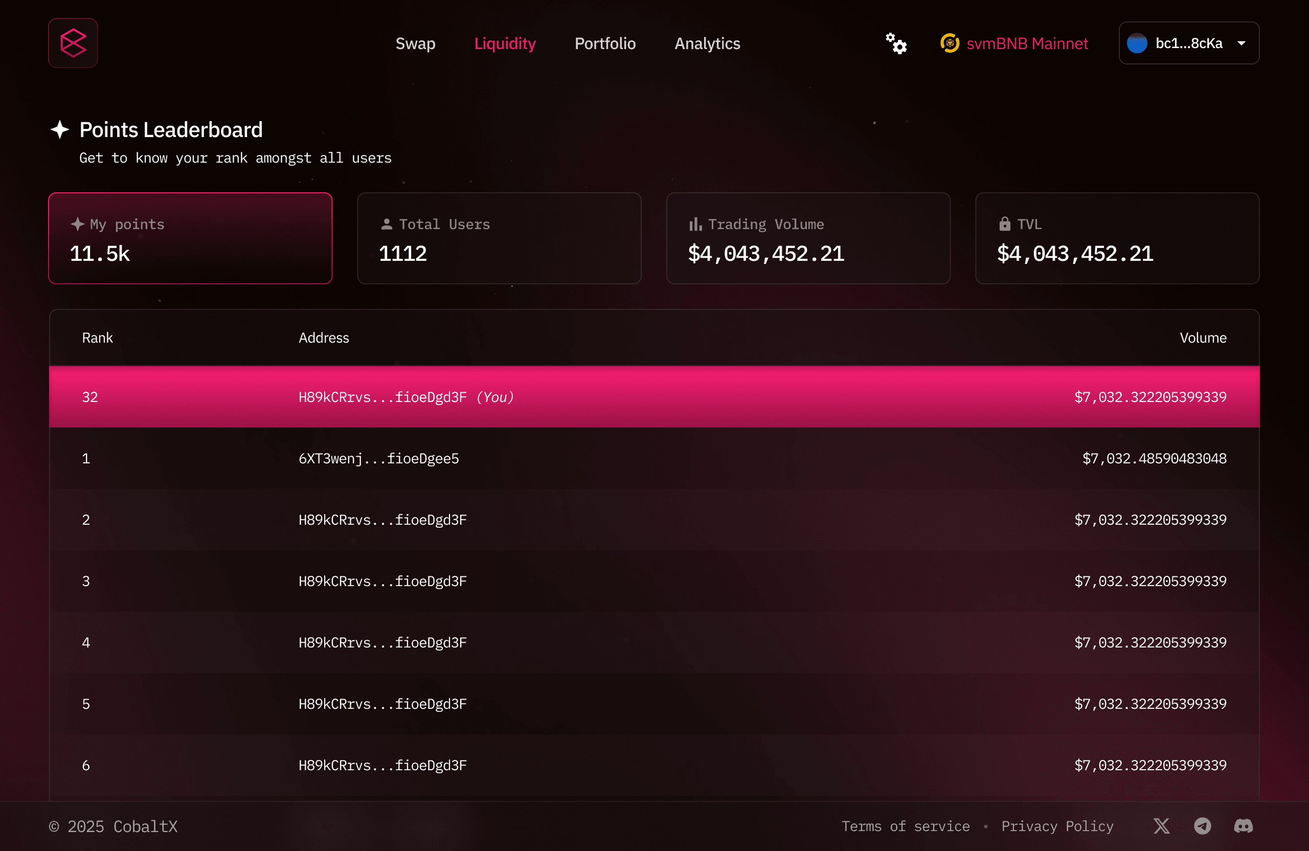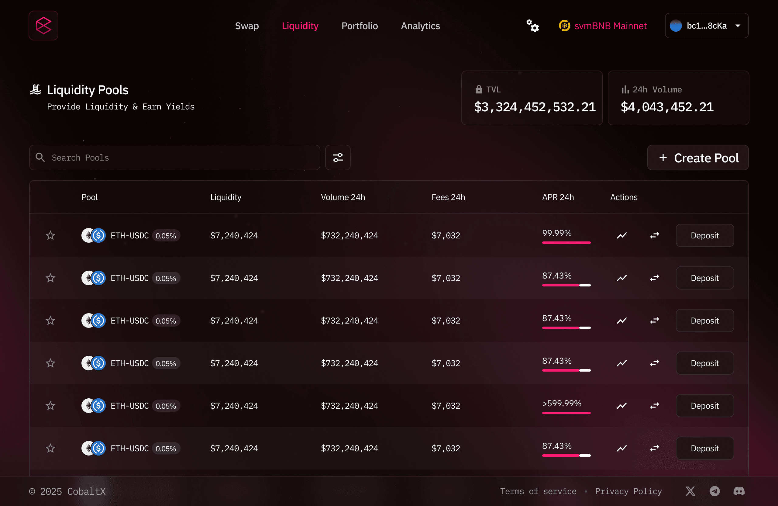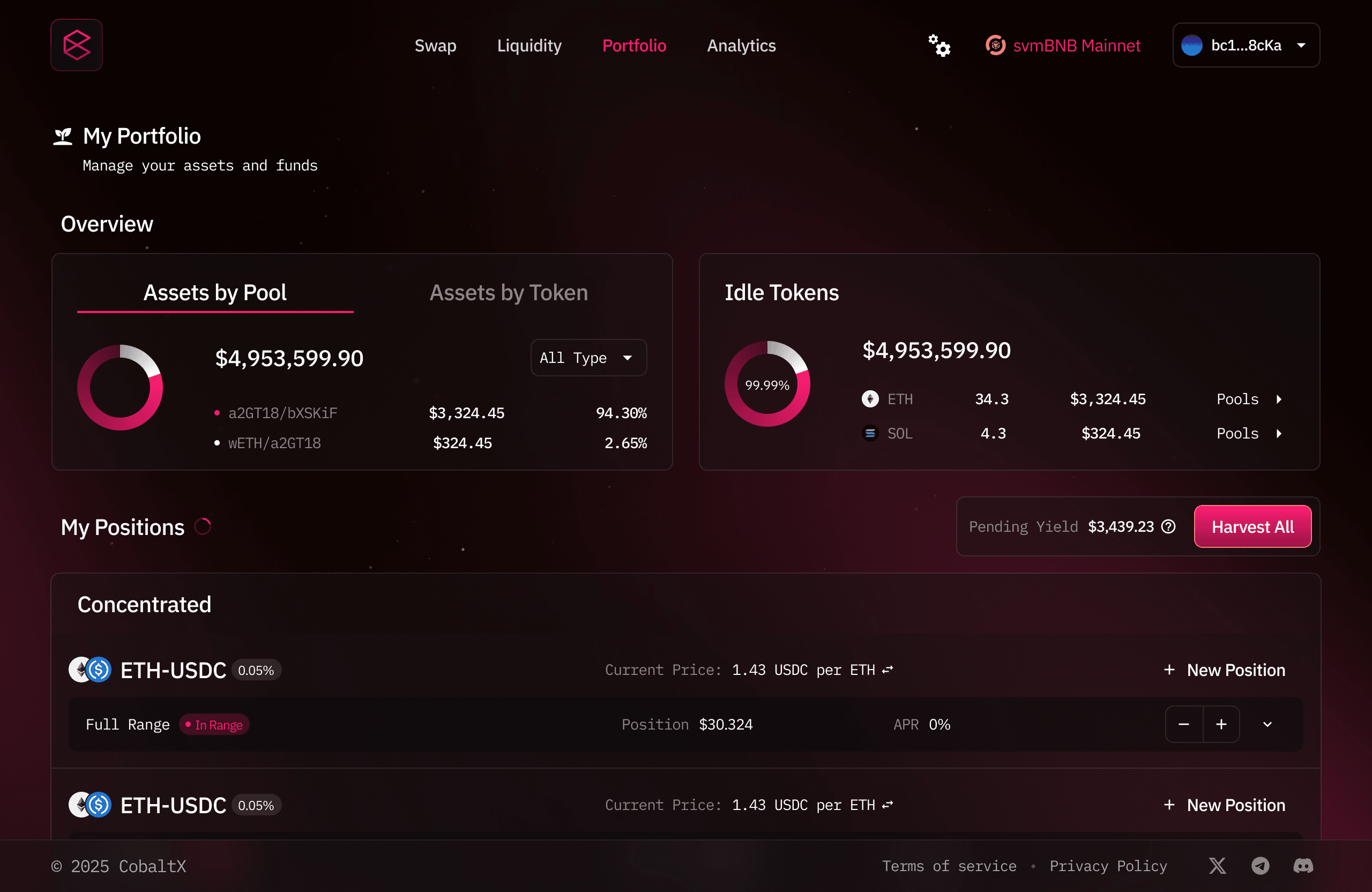 CobaltX is the native decentralized exchange (DEX) on the SOON Network, designed for ultra-fast and low-cost on-chain trading. Powered by a hybrid AMM and concentrated liquidity model, CobaltX enables seamless token swaps, permissionless liquidity pools, and efficient price discovery across the SOON ecosystem.