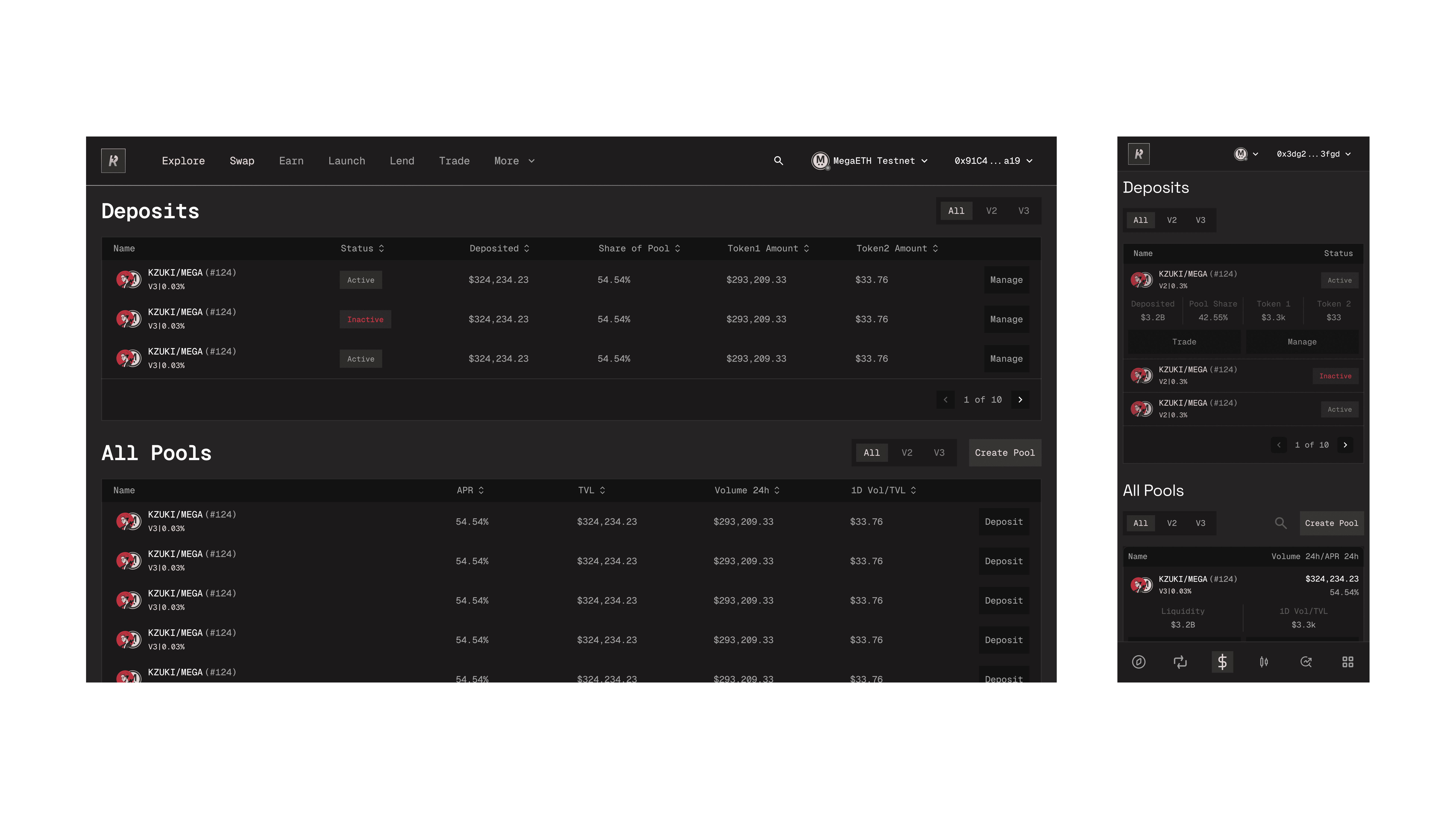 A single superapp where five financial primitives: trade, swap, lend, borrow & LP share one shell, one data model, and one interaction language. The order book leads, rather than the swap, so the chain's real-time advantage is visible the moment a user arrives. A retro-futuristic brand language set against a Bloomberg-density product UI, designed so that a degen launching a token and a first-time swapper can use the same surface without either feeling out of place.